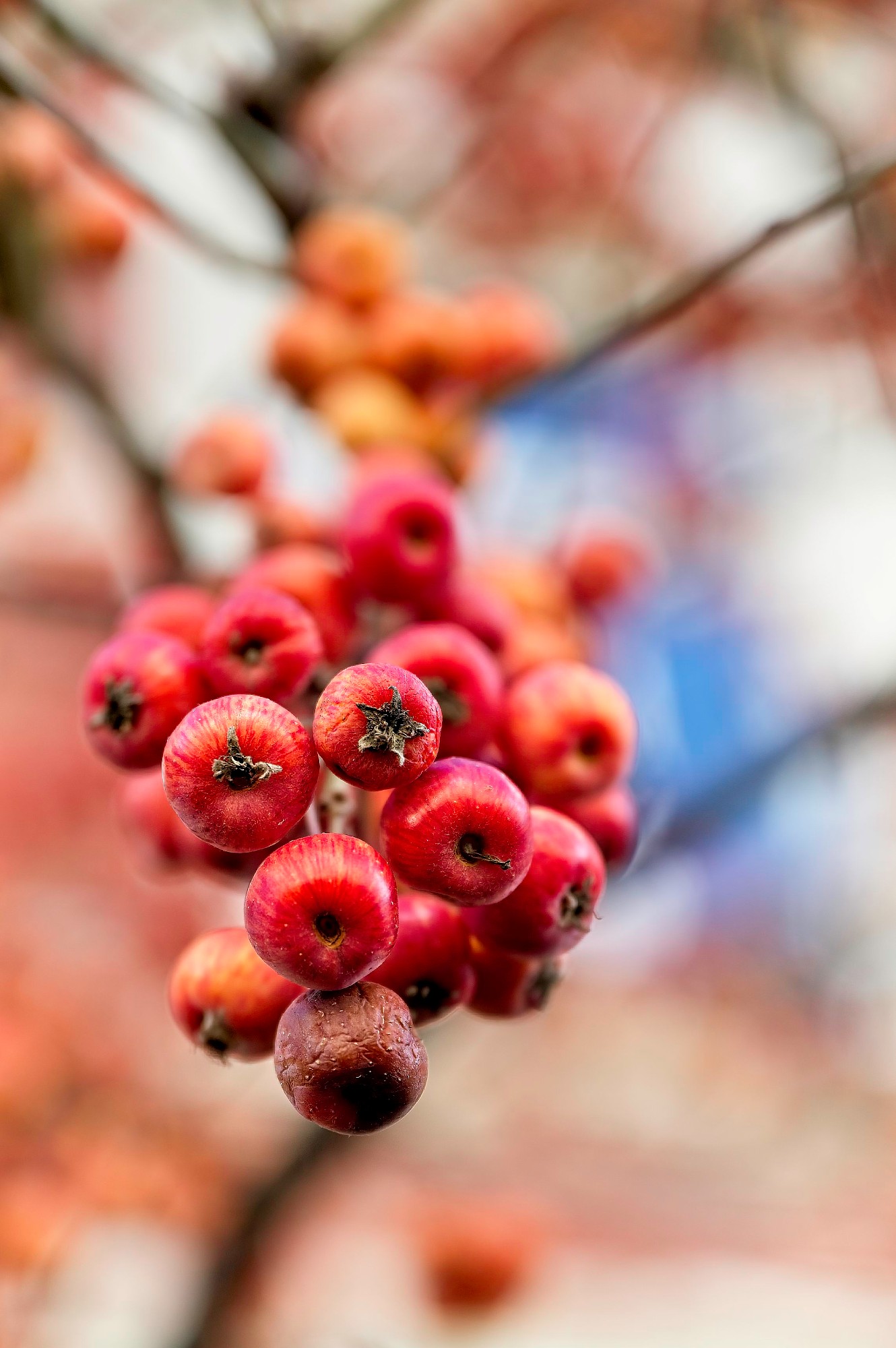 Das hier sind jedenfalls rote Zieräpfel … vor einem roten Backstein-Haus. Auf der anderen Straßenseite steht ein gelbes Haus und ein gelber Busch davor.